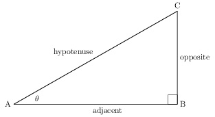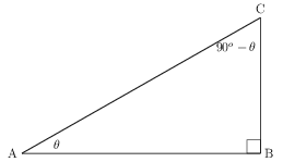 Now \[ \begin{align} \sin (90^o - \theta) &= \frac{\text{opposite}}{\text{hypotenuse}} \\ &= \frac{\text{AB}}{\text{AC}} \\ &= \cos \theta \end{align}\ \] and \[ \begin{align} \cos (90^o - \theta) &= \frac{\text{adjacent}}{\text{hypotenuse}} \\ &= \frac{\text{BC}}{\text{AC}} \\ &= \sin \theta \end{align}\ \]