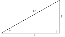 to find tan, you first need to find the value of x, so by Pythagoras \[ \begin{align} x^2 + 5^2 &= 13^2 \\ x^2 &= 13^2 - 5^2 \\ &= 169 - 25 \\ &= 144 \end{align} \ \] so x = 12. Now \[ \begin{align} \tan \theta &= \frac{\text{opposite}}{\text{adjacent}} \\ &= \frac{5}{12} \end{align} \ \]