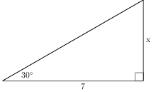 You are given two out of three pieces of information for tan, so \[ \begin{align} \tan 30^o &= \frac{x}{7} \\ x &= \tan 30^o \times 7 \\ \end{align} \ \] and using the tan function on your calculator gives \[ \begin{align} &= 7 \times 1.7321 \end{align} \ \]