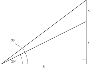 First, \[ \begin{align} \tan 38^o &= \frac{x+y}{8} \\ x+y &= 8\tan 38^o \\ \end{align} \ \] and \[ \begin{align} \tan 30^o &= \frac{y}{8} \\ y &= 8\tan 30^o \end{align} \ \] and \[ \begin{align} x &= x + y - y \\ &= 8\tan 38^o - 8\tan 30^o \\ &= 8(0.344 - 0.268) \\ &= 0.608 \end{align} \ \]