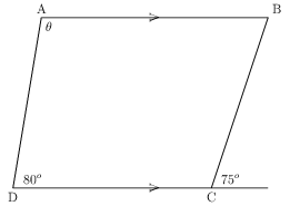 \[ \begin{align} \angle ABC &= 75^o \quad \text{ (alternate angles AB||DC)} \\ \angle BCD &= 105^o \quad \text{ angles in a straight line} \\ \theta &= 360^o - 80^o - \angle ABC - \angle BCD \\ &= 100^o \end{align}\]