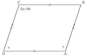 \[ \begin{align} \angle y &= 2x + 30 \quad \text{ (opposite angles in a parallelogram)} \\ 2x + 30 + x &= 180 \quad \text{(co-interior angles, AD||BC)} \\ 3x + 30 &= 180 \\ 3x &= 150 \\ x &= 50 \\ y &= 2x+30 \\ &= 130^o \end{align}\] Note - there are many ways to solve this. This solution used properties of a parallelogram.