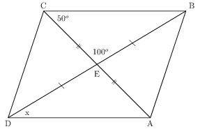 \[ \begin{align} \angle CAD &= \angle BCA = 50^o \quad \text{(alternate angles, AD||BC)} \\ \angle AED &= 100^o \quad \text{(vert opposite angles)} \\ x &= 180 - 150 \quad \text{(angle sum of a triangle)} \\ &= 30^o \end{align}\]